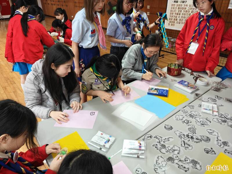 接著登場的是充滿在地特色的「傳統童玩闖關活動」,三民女童軍團用心設計多項台灣經典童玩關卡,包括熱塑片、踢毽子、橡皮筋等,讓韓國童軍親身體驗台灣童年的樂趣;同時,韓國童軍也分享電影「魷魚遊戲」廣為人知的打畫片(打紙牌)傳統遊戲,由於對彼此童玩規則尚不熟悉,過程中頻頻出現逗趣互動,引發現場笑聲不斷。